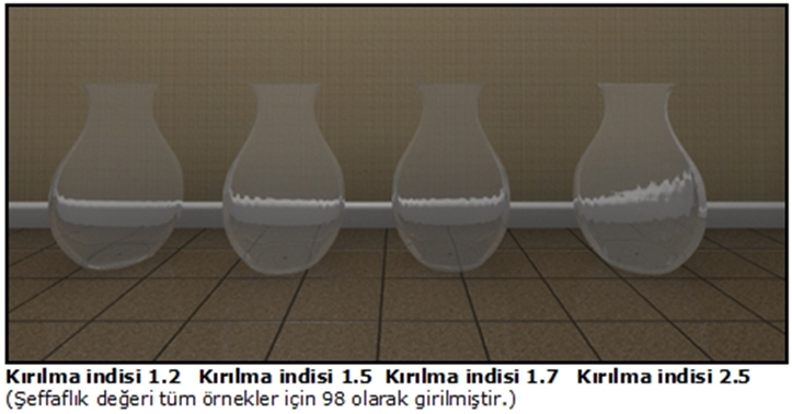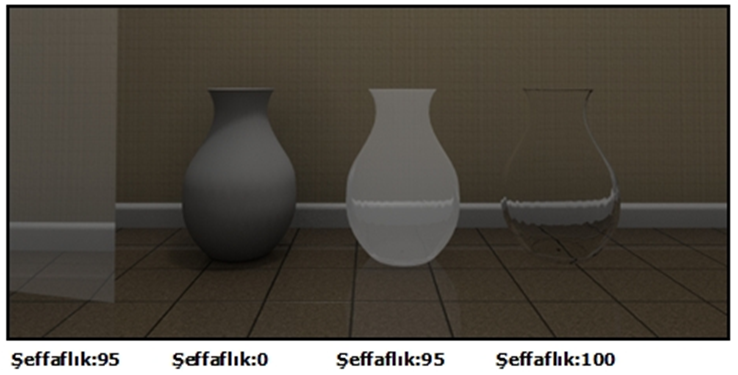 Değer ![]() 0-100 arası değer girilir. ![]() 1. obje tek yüzeyli bir eleman olmasından dolayı objenin arkasında kalan yüzey görülebilir. 3. objede, vazo formundan dolayı aynı özelliğe sahip olsa da arkasında kalan yüzey net görünmemektedir. Kısacası objenin materyalinden renderda nasıl bir etki oluşturması isteniyorsa, objenin formu da baz alınarak şeffaflık değeri girilmelidir. |