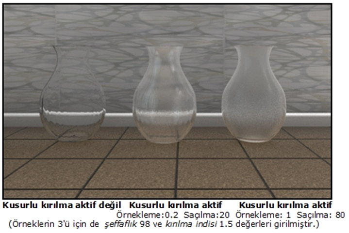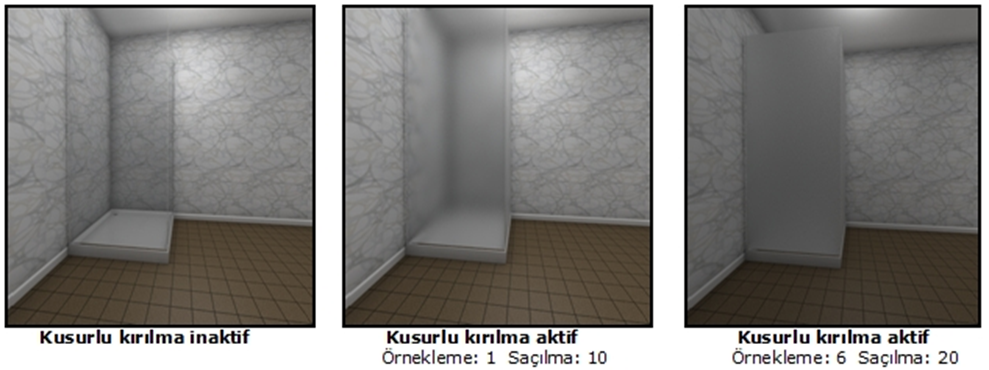 Kusurlu kırılma ![]() Örnekleme ve saçılma değerleri artırılarak materyale buzlu cam özelliği verme olanağı sağlar. Değerlerin artması noktaların homojen olarak dağılmasını sağlar. Buna bağlı olarak render süresi artabilir. ![]() ![]() Kusurlu kırılma özelliği vazo, bardak, duşa kabin ve cam duvar vb. için kullanılabilir. Örnekteki duşa kabinde kusurlu kırılma değerlerinin arttırılmasıyla buzlu cam etkisinin arttığı görülmektedir. |
