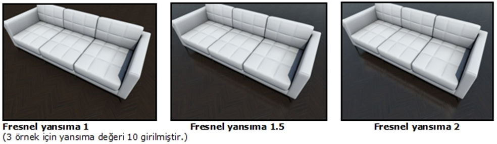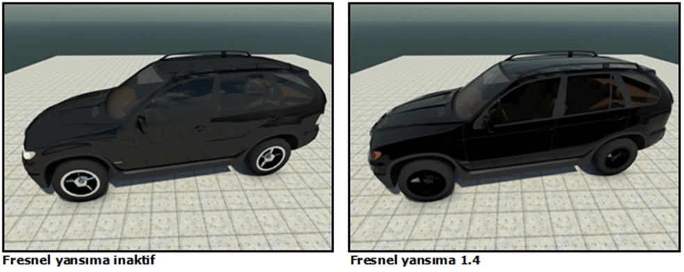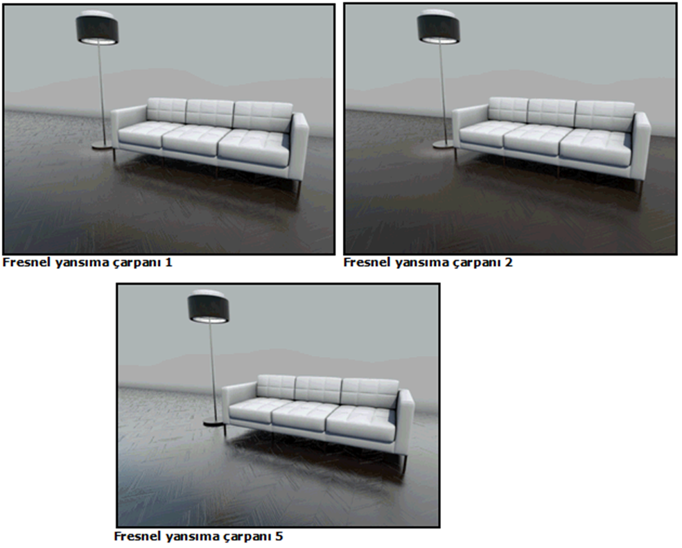 Fresnel yansıma çarpanı ![]() Yansıma çarpanı değeri arttıkça parke üzerinde yansıma daha belirgin hale gelmektedir. ![]() |