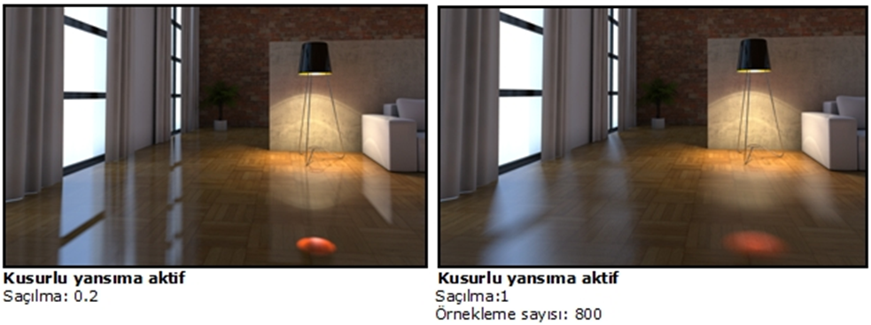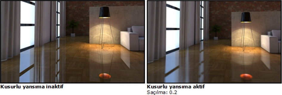 Kusurlu yansıma ![]() Obje yansımalarının bozulma derecesini belirler. Tüm objeler az ya da çok kusurlu yansıma özelliği gösterirler. ![]() Fresnel yansıma inaktifken parke, cam ve perde gibi diğer elemanları yansıtmıştır. Parkenin az da olsa yansıma özelliği olmalı, fakat ayna gibi birebir yansıtmamalıdır. Parke için kusurlu yansımayı aktif hale getirerek hem malzemenin dokusunu görmeyi hem de parkede kusurlu yansıma oluşturulması sağlanmalıdır. |