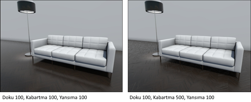 Kabartma ![]() Oluşturulan malzemeyi 3B olarak hissetmeye olanak sağlar. ![]() |