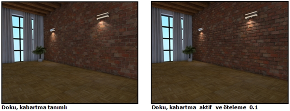 Öteleme ![]() Materyale tanımlanan siyah renkteki değere göre materyalin 3B kazanması sağlanır. ![]() Öteleme değerinin artmasıyla derzler arasındaki mesafenin değiştiği 2. ve 3. örneklerde görülür. Kalite değeri 1- 5 arası değer girilir. Bu değer render kalitesini artırır. Materyale öteleme özelliği verilmesi render süresini uzatacaktır. |
