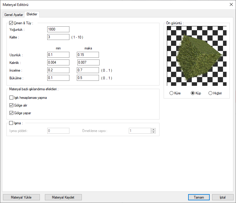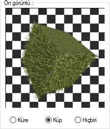 Çiment & Tüy ![]() Efektler sekmesinde çimen ve tüy aktif hale getirilerek çimen veya halının 3B hale getirilmesi sağlanır. |