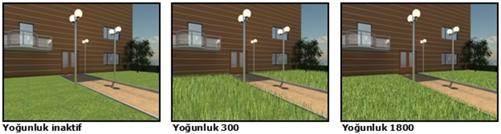Yoğunuk ![]() Birim alana düşen çim miktarıdır. Yoğunluk sayısının artmasına bağlı olarak render süresi uzayabilir. ![]() |