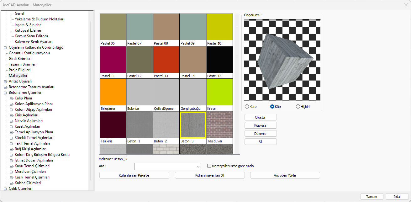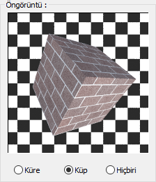 Öngörüntü ![]() Seçilen materyalin render alındığında elde edilecek görüntüsünün önizlemesi yapılır. Küre Önizleme küre objesi üzerinde gösterilir. ![]() Küp Önizleme küp objesi üzerinde gösterilir. ![]() Hiçbiri Önizleme gösterilmez. ![]() |