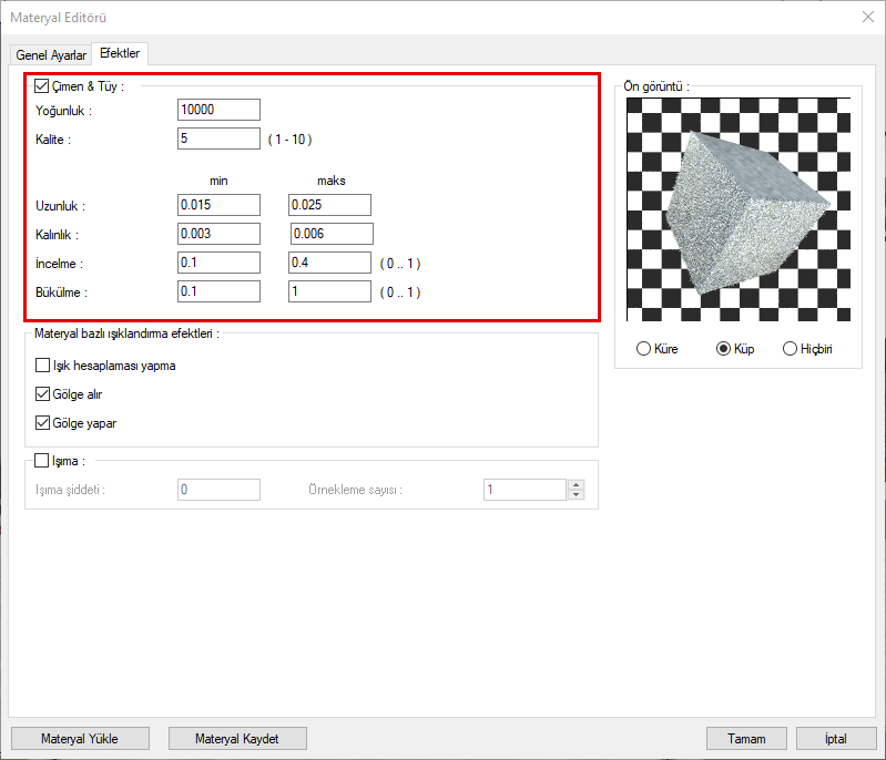 Materyal editörü diyaloğu efektler sekmesinden çimen & tüy özelliğine ulaşabilirsiniz.