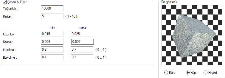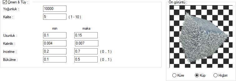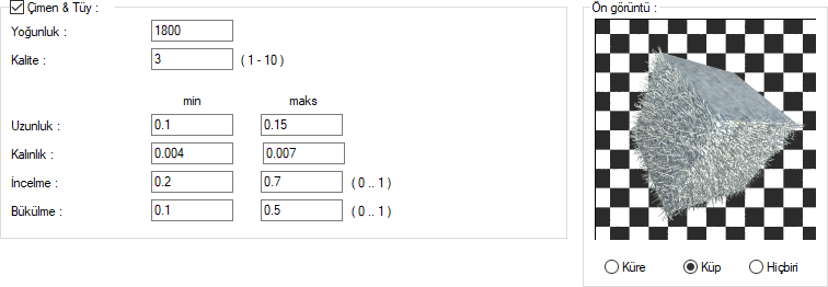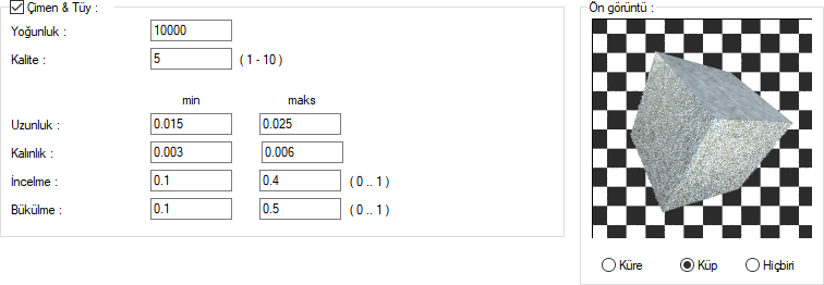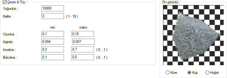 Çimen & Tüy özelliği ile çimen, halı gibi materyaller oluşturulur. Ayarları düzenlenerek farklı kalite ve uzunluklarda çimen/tüy elde edilir.