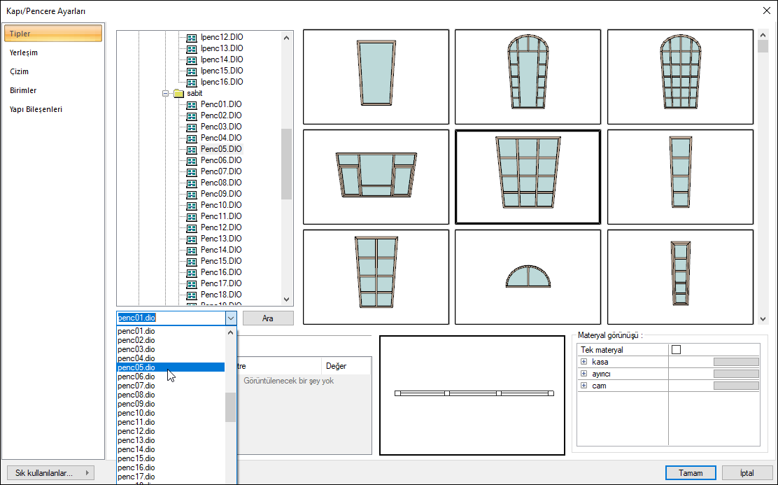 Kütüphane, kapı/pencere, materyal menülerinde istenilen obje ve elemanlara ismiyle arama yapılarak ulaşılır.