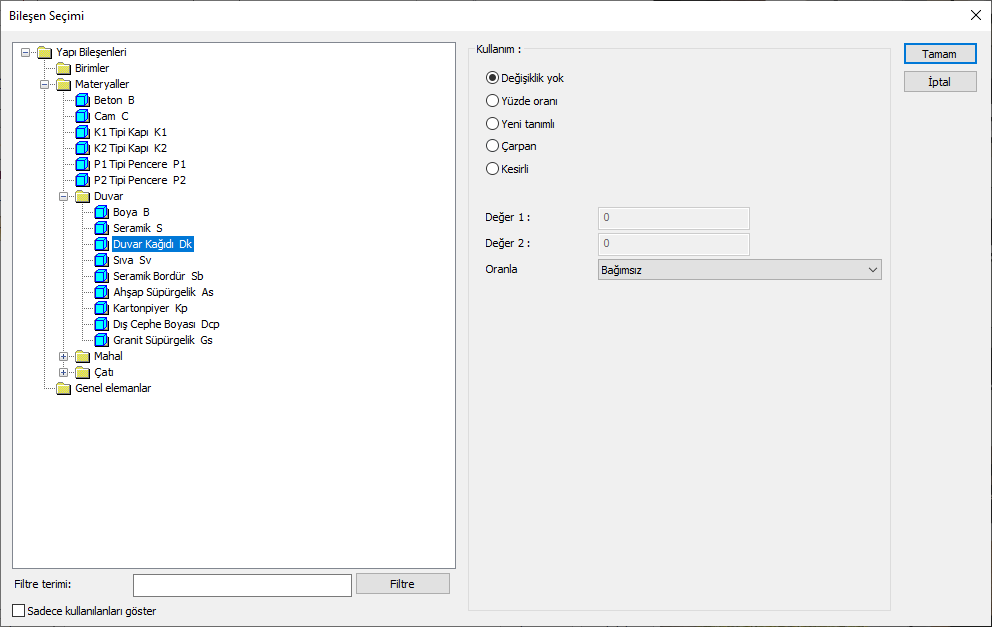 Tamam butonu tıklayın. “Bileşen Seçimi” diyaloğu kapanacaktır. Yapı Bileşenleri sekmesinde malzemeye ait özet bir satır görünecektir. Bir objeye birden fazla malzeme ataması yapılabilir.