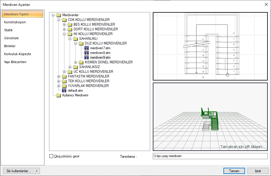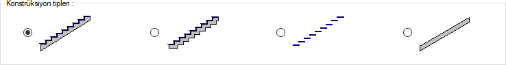 Konstrüksiyon tipleri ![]() Düz, kırımlı, limon kirişli ve rampa tipi merdiven sistemlerinden biri farenin sol tuşu ile tıklanarak seçilir. |