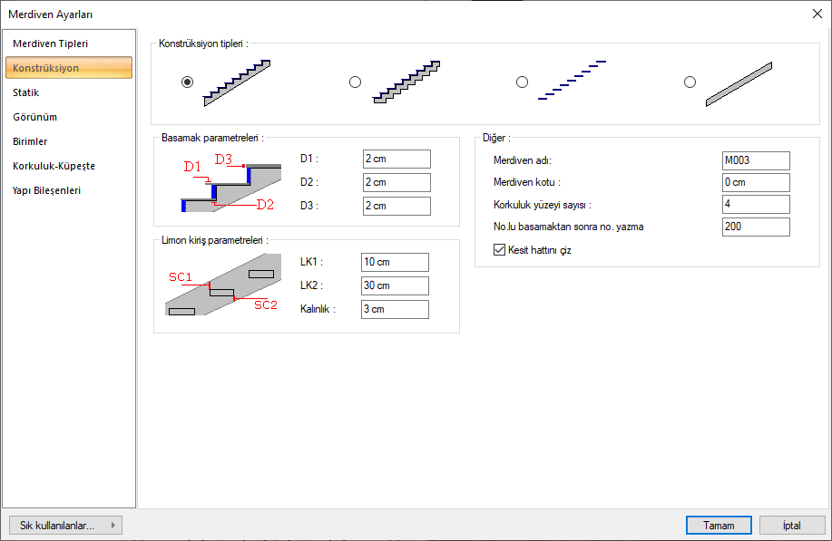 Basamak parametreleri ![]() D1 basamak kaplaması burun uzunluğu, D2 rıht kaplaması kalınlığı, D3 basamak kaplaması kalınlığıdır. Kaplama istenmiyorsa bu değerler sıfır girilir. |