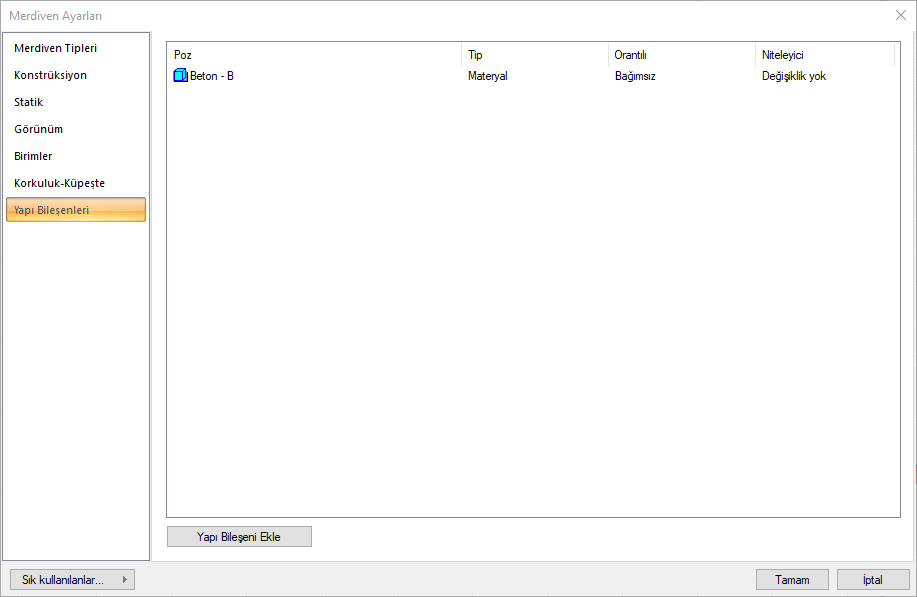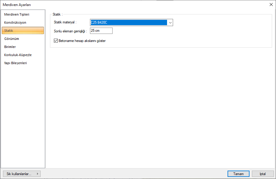 Statik materyal ![]() Merdiven elemanında kullanılacak statik materyali listeden seçin. |