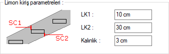 Limon kiriş parametreleri ![]() LK1 ve LK2 limon kiriş yüksekliğini tayin eder. Şekil üzerinde gösterilmiştir. Kalınlık parametresi de limon kiriş kalınlığıdır. |