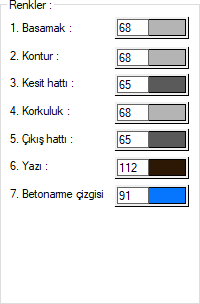 Renkler ![]() Planda merdiveni oluşturan çizgiler için ayrı renk seçilir. Çizgiler diyaloğun solundaki şekil üzerinde mavi rakamlarla numaralandırılmıştır. Renk kutucuğu tıklandığında açılan pencereden uygun renk seçilir. |
