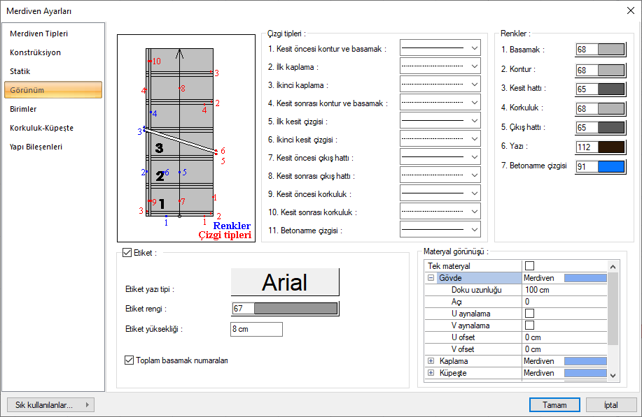Etiket ![]() Etiket işaretlenerek merdiven üzerinde rıht sayısı, basamak yüksekliği ve genişliği gösterilir. Etiket yazı tipi ile rıht sayısı, basamak yükseklik ve genişlik yazısının yazı tipi seçilir. Etiket rengi ile rıht sayısı, basamak yükseklik ve genişlik yazısının yazı rengi seçilir. Etiket yüksekliğine rıht sayısı, basamak yükseklik ve genişlik yazısının yazı yüksekliği girilir. Toplam basamak numaraları işareti kaldırılarak rıht sayısı, basamak yüksekliği ve genişliği her kolda ayrı gösterilir. İşaretlenirse toplam değerler gösterilir. |