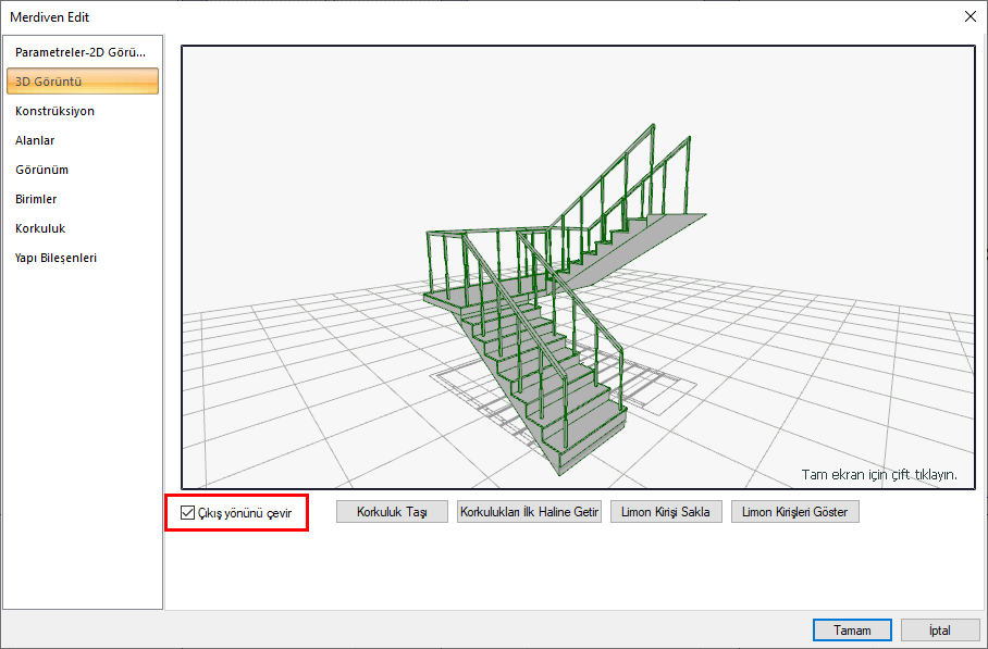 Yönü değiştirilmek istenen merdivenin Merdiven Edit diyaloğu 3D Görüntü sekmesinden ulaşabilirsiniz.