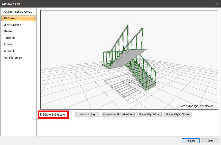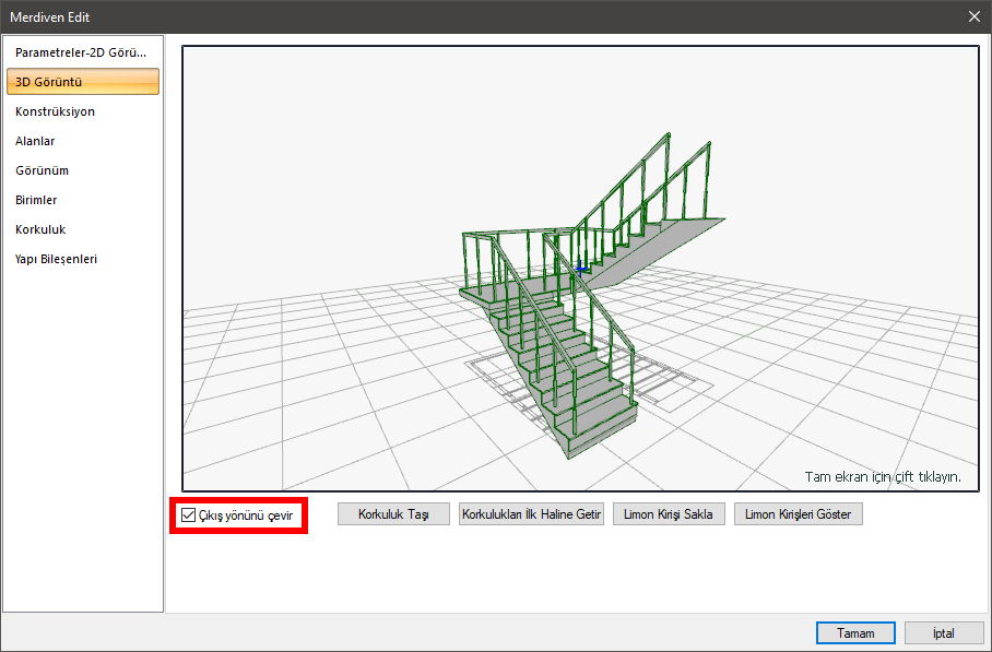 Merdivenin çıkış yönü merdiven ayarlarındaki "3D Görüntü" sekmesinden "Çıkış yönünü çevir" seçeneği işaretlenerek değiştirilir.