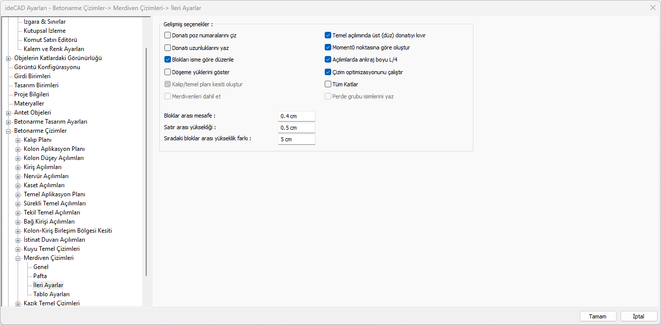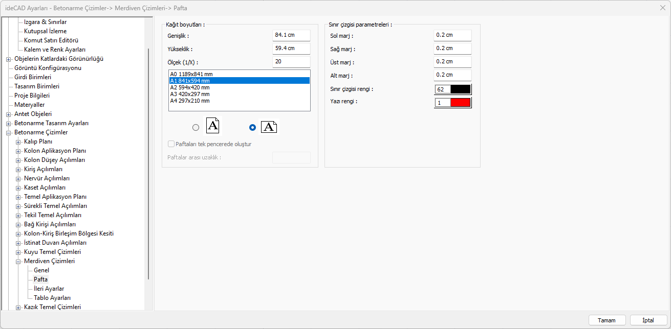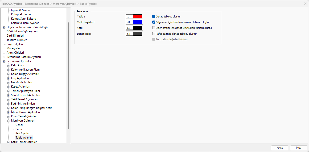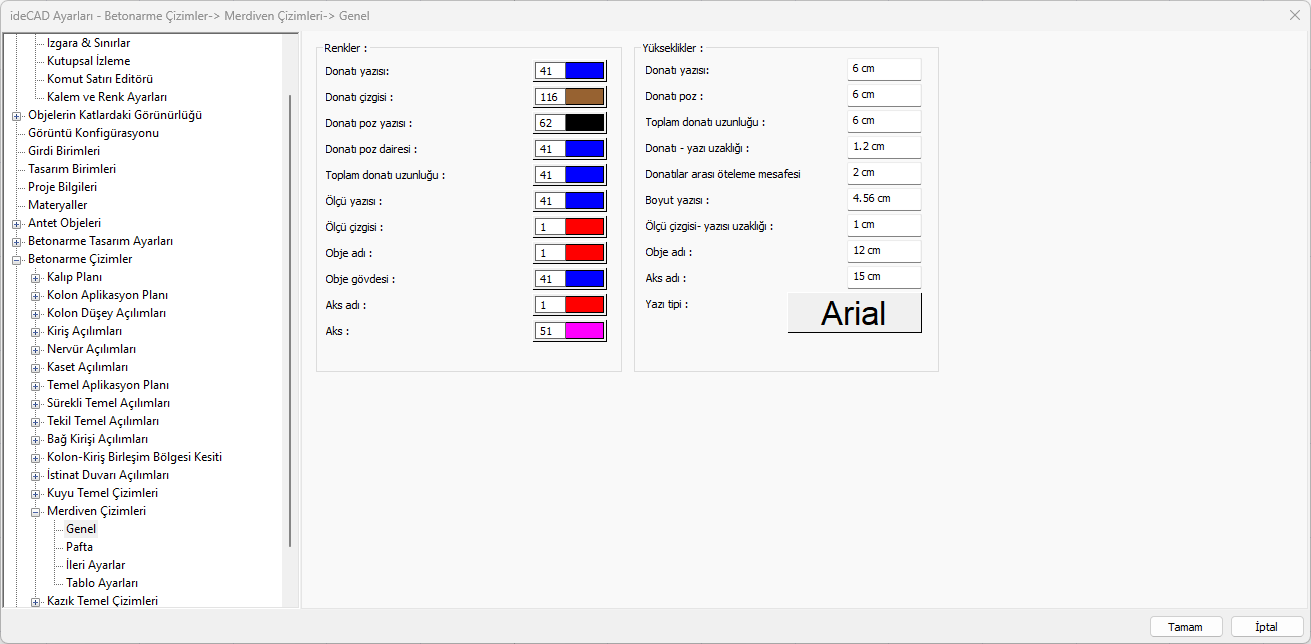 Merdiven çizimlerine ait yazıların renk, büyüklük ve tip, pafta ve tablo ayarları düzenlenir.