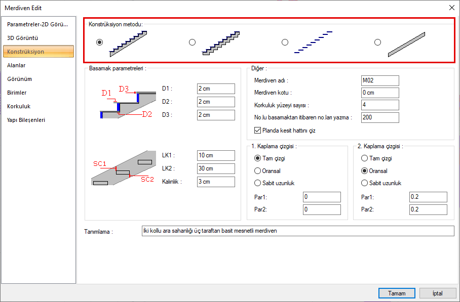 Merdiven ayarları ve merdiven edit diyaloglarında konstrüksiyon sekmesinden konstrüksiyon tiplerine ulaşabilirsiniz.