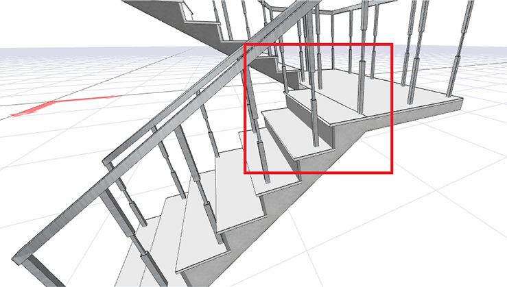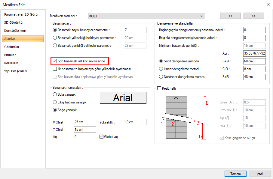 Son basamak üst kot seviyesinde özelliği ile merdivenlerin son basamağı sahanlıkla aynı kota getirilir. Aynı zaman da son basamağı kat döşemesi ile aynı kota getirmek için de bu özellik kullanılır.
