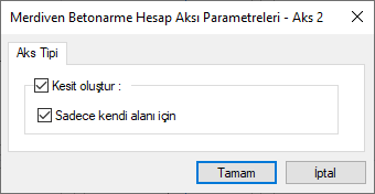 Kesit oluştur ![]() Seçenek işaretlenirse merdiven çiziminde, hesap aksın geçtiği konumdan merdiven kesiti hazırlanır. İşaretlenmezse kesit hazırlanmaz. |