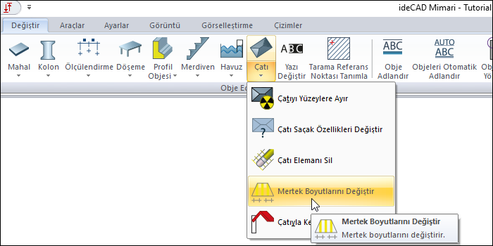 Mertek boyutlarını değiştir komutuna ribbon menü Değiştir sekmesi Obje Edit başlığı altından ulaşabilirsiniz.