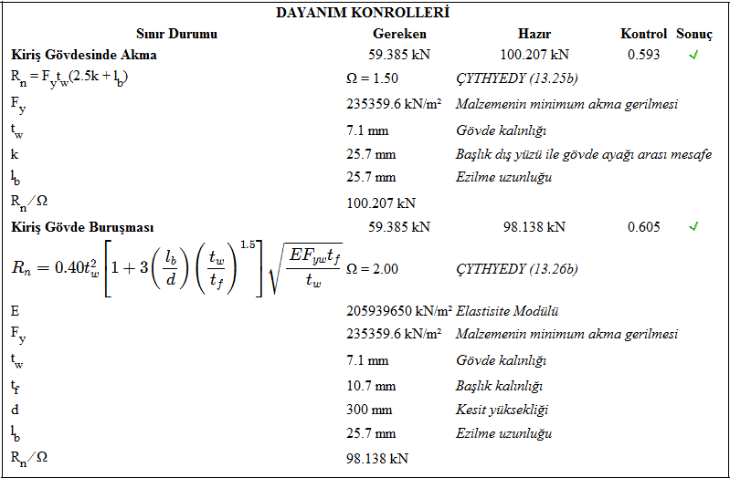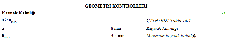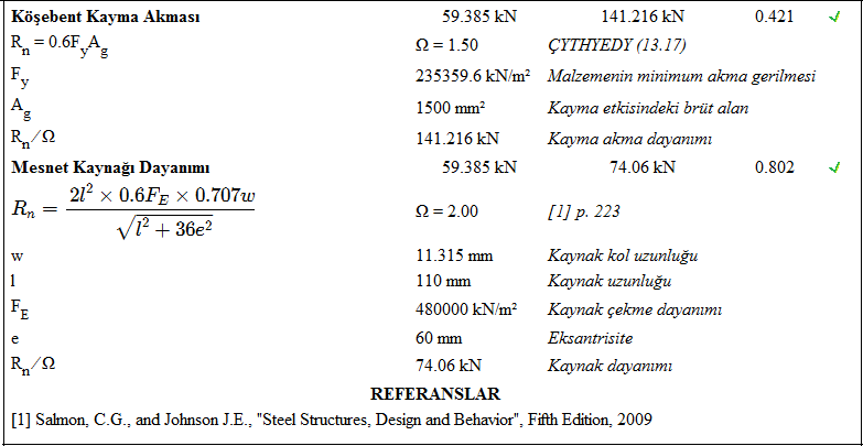 Mesnet köşebentli birleşim raporunda Çelik Yapıların Tasarım, Hesap ve Yapım Esasları (ÇYTHYEDY) (GKT ve YDKT) veya AISC 360-16 (ASD ve LRFD) yönetmeliklerine göre tasarımı yapılan birleşimin kontrolleri verilir.