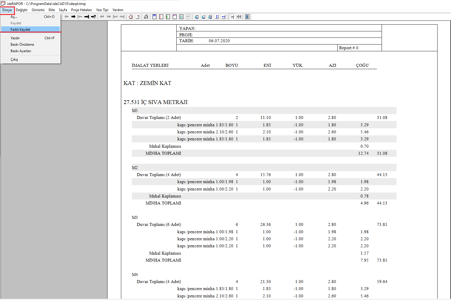 Bunun için metraj raporu alındıktan sonra, dosya menüsünden farklı kaydet denilip pdf uzantısı seçilir.
