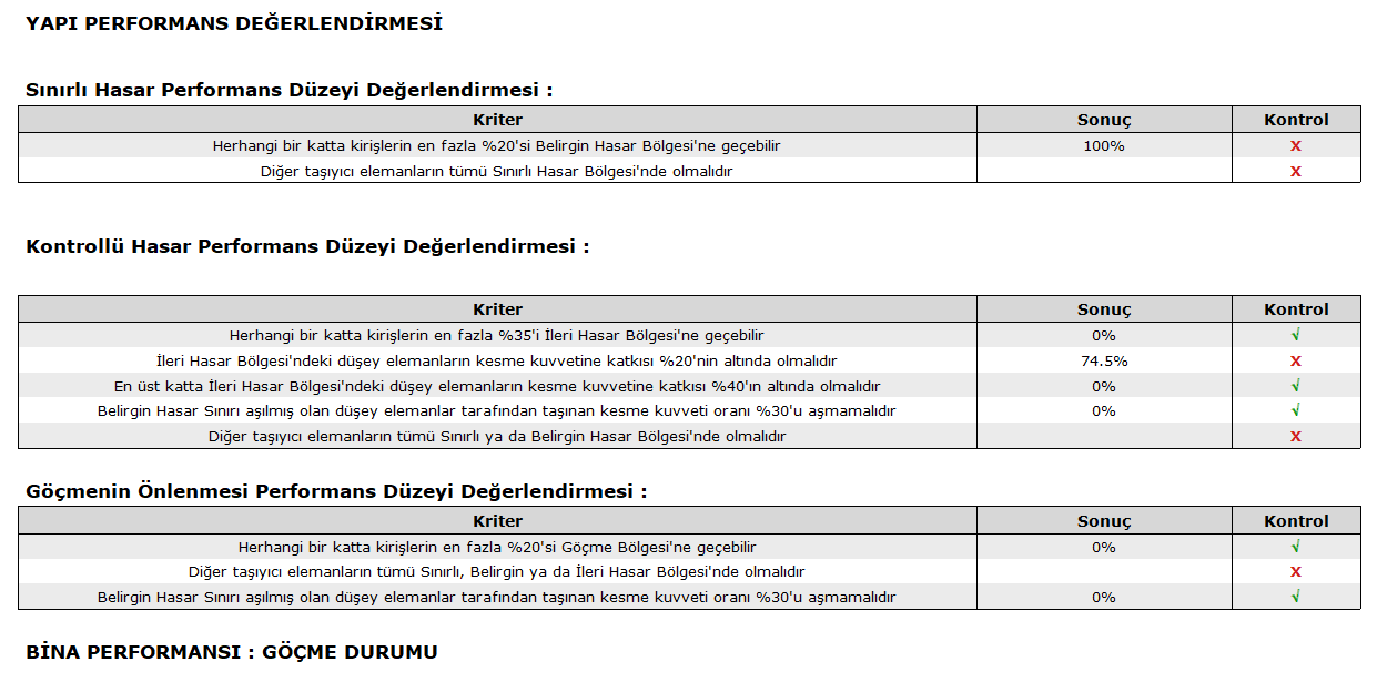 Mevcut bina Göçmenin Önlenmesi Performans Düzeyi 'ni sağlamıyorsa Göçme Durumu 'ndadır. Bu durumda bina kullanımı can güvenliği bakımından sakıncalıdır.