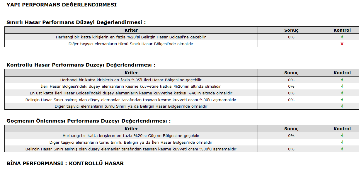 Yukarıdaki koşullar sağlanıyor ise bina Kontrollü Hasar (KH) performans düzeyinde kabul edilir ve raporlanır.