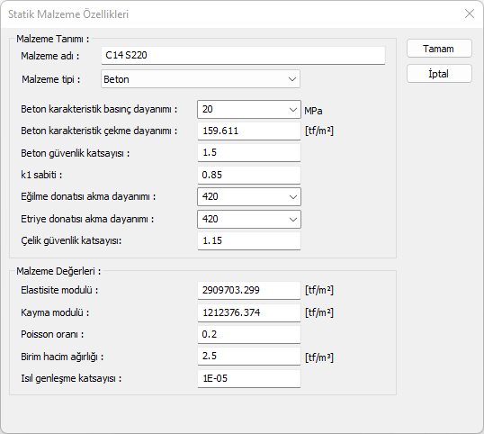 Seçtiğiniz beton tipine göre beton karakteristik çekme dayanımı, k1 sabiti, elastisite ve kayma modülleri otomatik olarak değişecektir.