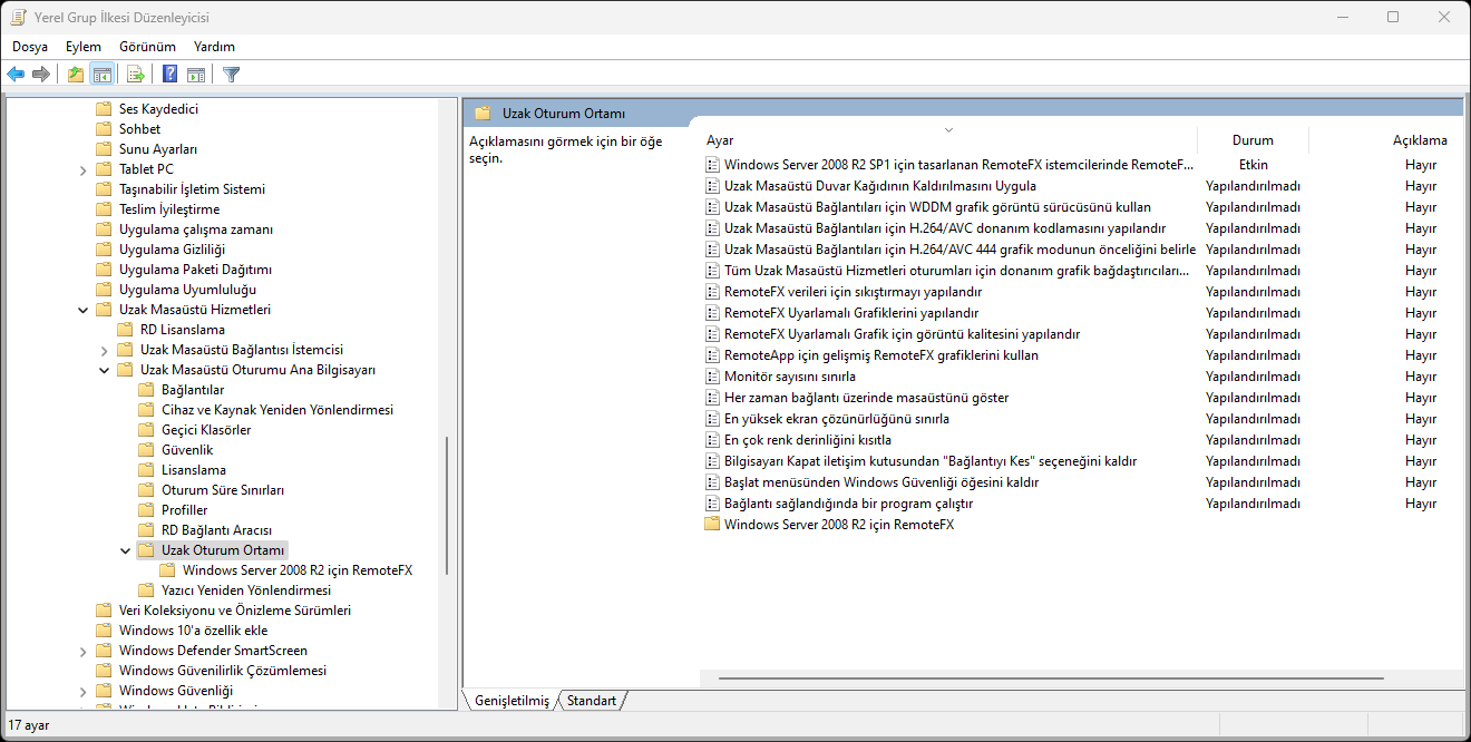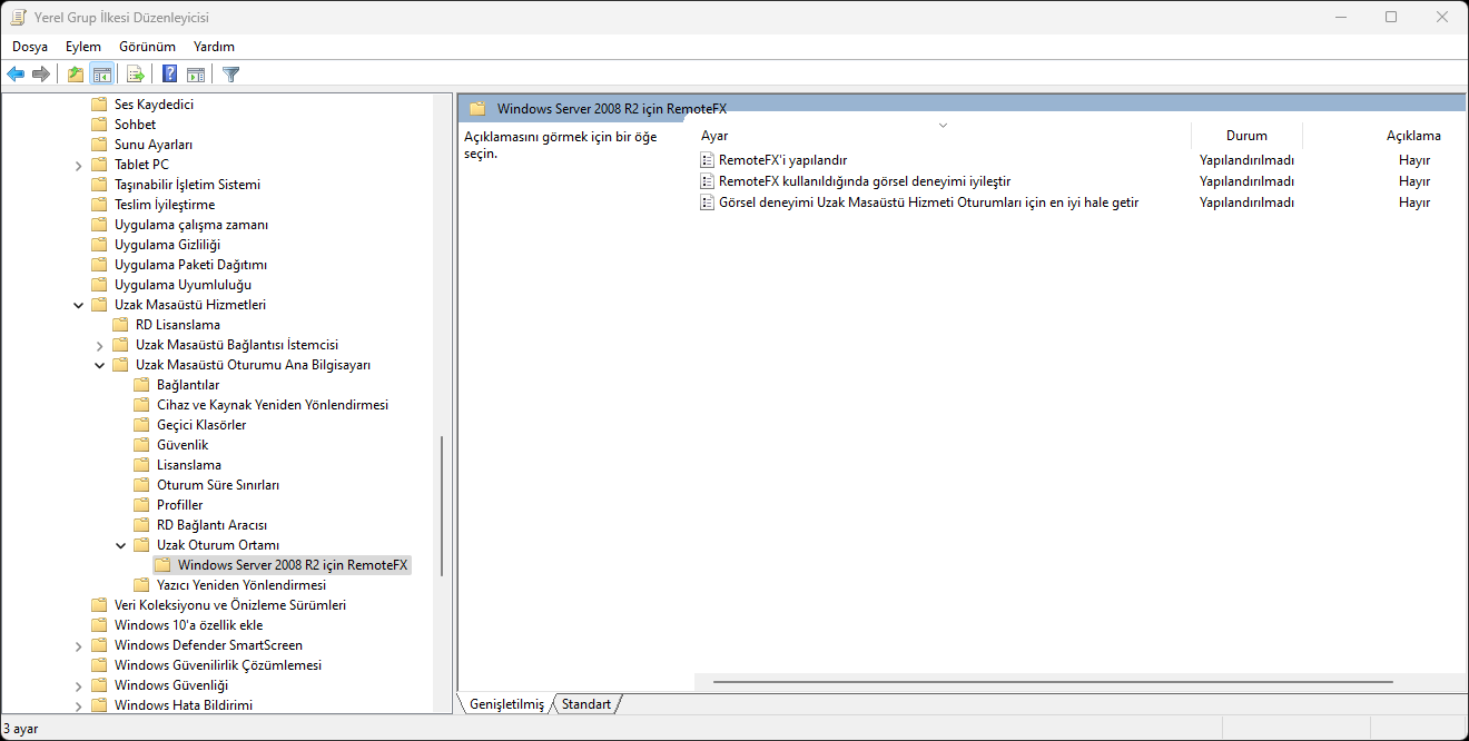 Sol taraftaki gezinme panelinden, Bilgisayar Yapılandırması > Yönetim Şablonları > Windows Bileşenleri > Uzak Masaüstü Hizmetleri > Uzak Masaüstü Oturumu Ana Bilgisayarı > Uzak Oturum Ortamı > Windows Server 2008 R2 için RemoteFX'i seçin.