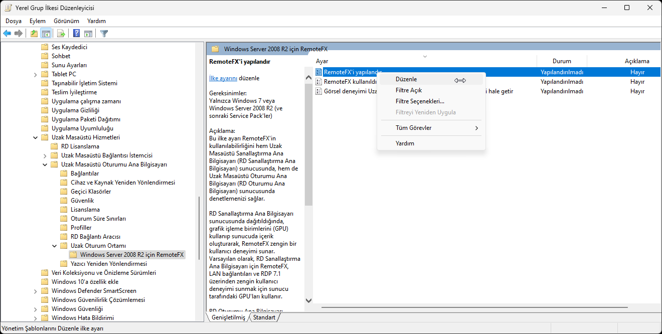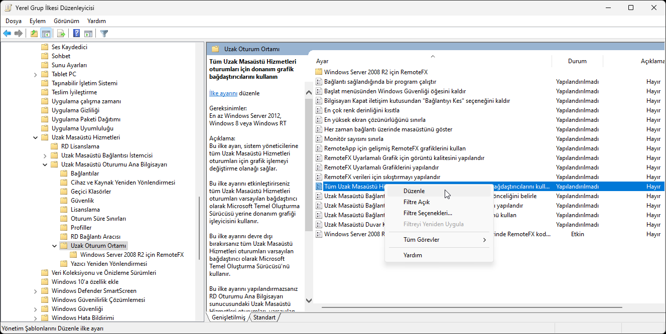 Tüm Uzak Masaüstü Hizmetleri oturumları için donanım grafik bağdaştırını kullanın ve RemoteFX verileri için sıkıştırmayı yapılandıır satırları üzerine gelin ve farenin sağ tuşuna tıklayın. Açılan listeden Düzenle üzerine tıklayın.