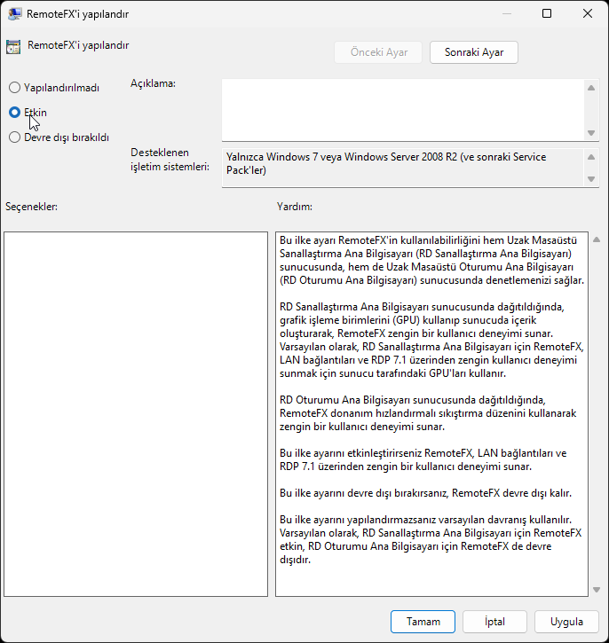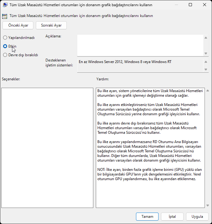 Microsoft Uzak Masaüstü Bağlantısında Grafik Kartı Hızlandırma Ayarları
