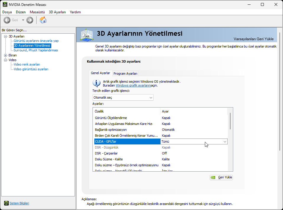 3D Ayarları > 3D Ayarlarının Yönetilmesi > Genel Ayarlar sekmesi altında , CUDA – GPU'lar = TÜMÜ ve OpenGL ile görüntü oluşturma GPU’su = Otomatik seç seçeneklerinin ayarlandığından emin olun.