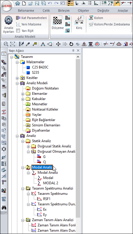 Modal analiz diyaloğuna yapı ağacı analiz bölümünde modal analiz satırına farenin sağ tuşuna tıklayarak da ulaşabilirsiniz.