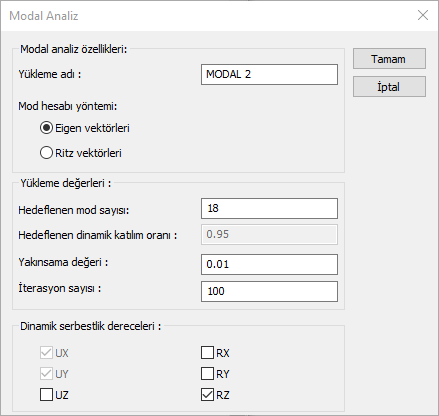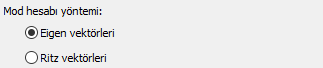 Mod hesabı yöntemi ![]() Modal analizde kullanılacak hesap yöntemlerinden "Eigen vektörleri" veya "Ritz vektörleri" seçeneklerinden biri seçilebilir. |