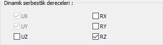Dinamik serbestlik dereceleri ![]() Gözönüne alınmayan serbestlik dereceleri isteğe göre iptal edilebilir. Bu tanımlı serbestliklerden Rz işaretini kaldırırsanız Burulma serbestliğimi kaldırmış olursunuz. (Eksik deprem etkisi oluşur) |