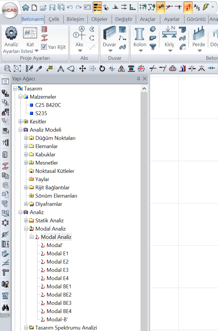 Herhangi bir sistemde analiz yapıldığında ideCAD otomatik olarak modal analiz için bir tane modal analiz durumu oluşturacaktır. Analiz ayarlarından “iki yükleme durumlu hesap yöntemi” seçeneği seçildiğinde bodrum içeren yapılar için 10 adet modal analiz tanımlanmaktadır. Bu modal analiz durumlarından 4 tanesi sırasıyla üst yapı için kütle merkezinin X ve Y yönlerinde +-%5 kaydırılması ile elde edilen modal analiz durumlarıdır (Modal E1, Modal E2, Modal E3, Modal E4). Diğer 4 tane modal analiz durumu bodrumlu yapının bodrum kat kütlelerinin göz önüne alınması ve kütle merkezinin X ve Y yönlerinde +-%5 kaydırılması ile elde edilen modal analiz durumlarıdır (Modal BE1, Modal BE2, Modal BE3, Modal BE4). Modal' üst yapı için ekdışmerkezlik etkisi olmadan tanımlanan modal analiz durumu ve Modal-B' bodrumlu yapının bodrum kat kütlelerinin göz önüne alınması ile ekdışmerkezlik etkisi olmadan tanımlanan modal analiz durumudur.