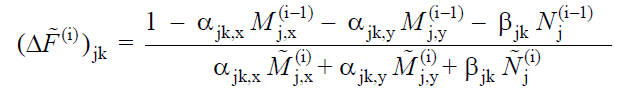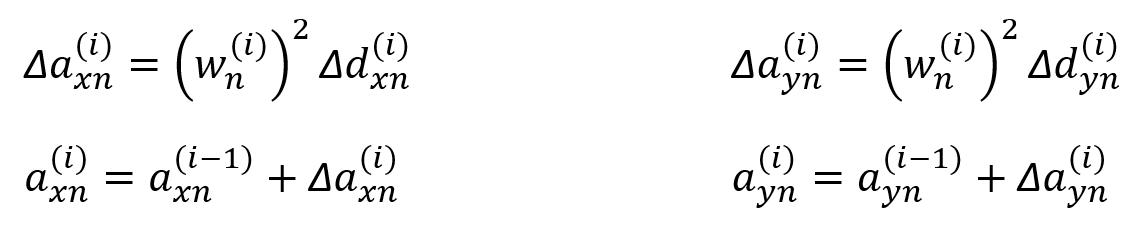 Örnek bir ( X ) doğrultusu için, Δαxn(i) (i)’inci adımda tüm modlara ait modal ivme artımları ve (i)’inci itme adımının sonundaki birikimli modal ivme değeri αxn(i) şeklinde ifade edilir. Benzer şekilde ( Y ) doğrultusu için, Δαyn(i) (i)’inci adımda tüm modlara ait modal ivme artımları ve (i)’inci itme adımının sonundaki birikimli modal ivme değeri αyn(i) şeklinde ifade edilir. Bu değerler aşağıdaki bağıntılar ile bulunmaktadır.