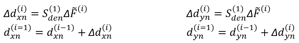 Sden(1) ve :art_ölç_kat: bulunduktan sonra (i)’inci itme adımında n ’inci moda ait modal yerdeğiştirme artımı Δdn(i) ve (i) ’inci itme adımı sonunda n ’inci moda ait modal yerdeğiştirme dn(i) değerleri aşağıdaki denklemler ile bulunmaktadır. Ancak bu değerler her bir doğrultu için bulunmalıdır. Örnek bir ( X ) doğrultusunda (i)’inci itme adımında n ’inci moda ait modal yerdeğiştirme artımı Δdxn(i) ve (i) ’inci itme adımı sonunda n ’inci moda ait modal yerdeğiştirme dxn(i) şeklinde ifade edilmektedir. Benzer şekilde ( Y ) doğrultusu için aynı ifadeler sırasıyla Δdyn(i) ve dyn(i) olarak ifade edilmektedir. Bu değerler aşağıdaki bağıntılar ile bulunmaktadır.