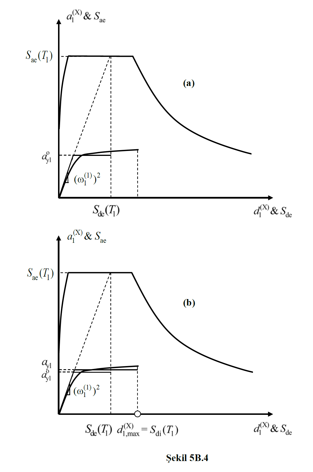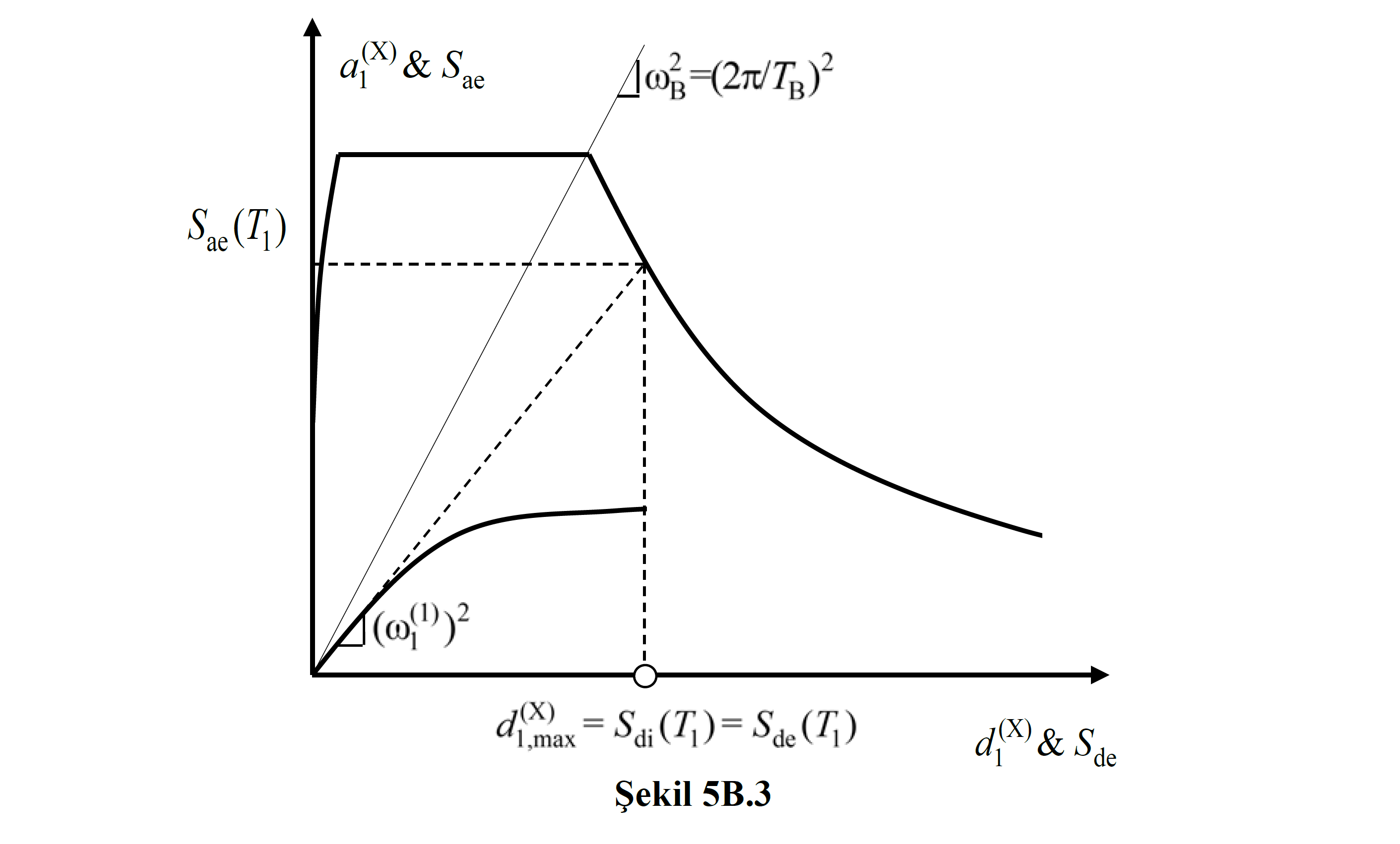 Denklem 5B.12 'de belirtilen modal tek serbestlik dereceli sistemin en büyük yerdeğiştirmesi d1,max(X) , Sabit Tek Modlu İtme Yöntemi veya Değişken Tek Modlu İtme Yöntemi kullanılarak elde edilen koordinatları modal yerdeğiştirme - modal sözde ivme olan modal kapasite diyagramı üzerinde bina performansını belirleyen performans noktasının yatay bileşenidir. Denklem 5B.12 'ye göre Yatay Elastik Tasarım Spektrumu 'nun dönüştürülmesi ile lede edilen ve koordinatları spektral yerdeğiştirme - spektral ivme (Sde , Sae) olan doğrusal deprem spektrumu 'nun yatay eksenindeki Sdi(T1) değeri ile performans noktasının modal yerdeğiştirme değeri d1,max(X) birbirine eşittir. Bu iki grafiğin üst üste çizimi TBDY Şekil 5B.3 'te gösterilmiştir.