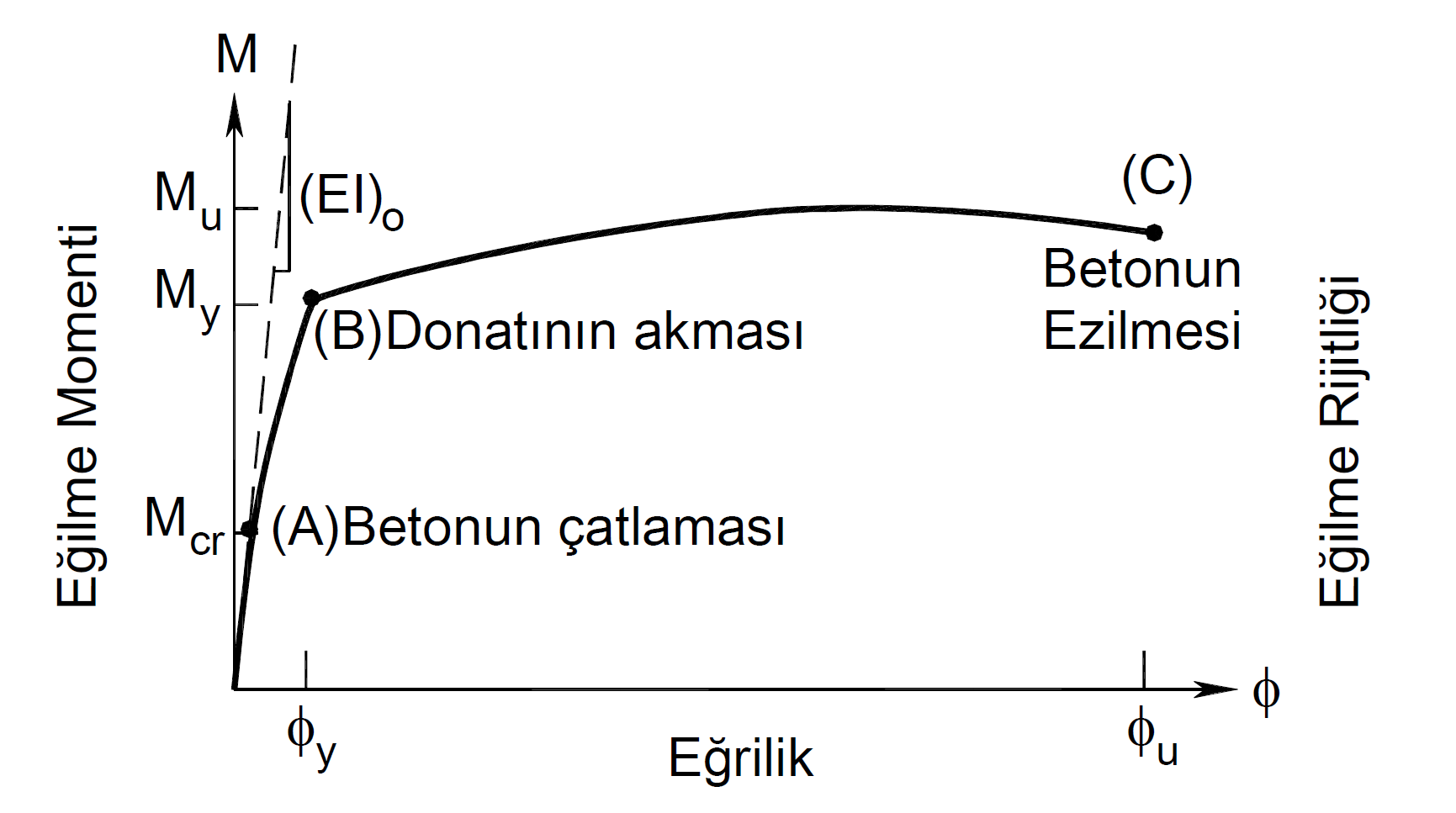Yukarıdaki grafikte ( B ) noktası çekme donatısının donatının aktığı noktadır. Bu noktadaki moment değerine akma momenti My ve eğrilik değerine akma eğriliği ϕy adı verilir.