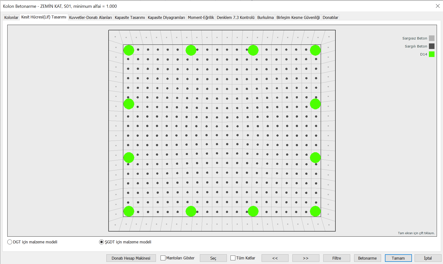 Aşağıdaki resimde moment-eğrilik analizi yapılırken kullanılan kesit hücresi-lif (fiber) modeli gösterilmiştir. Burada açık gri olarak gösterilen lifler sargısız beton, koyu gri olarak gösterilen lifler sargılı beton, yeşil ile gösterilen lifler donatı modeli ile tanımlanmaktadır. Bu malzeme modelleri oluşturulurken Bilgi Düzeyi Katsayısı ve Mevcut Malzeme Dayanımları gözönüne alınır.