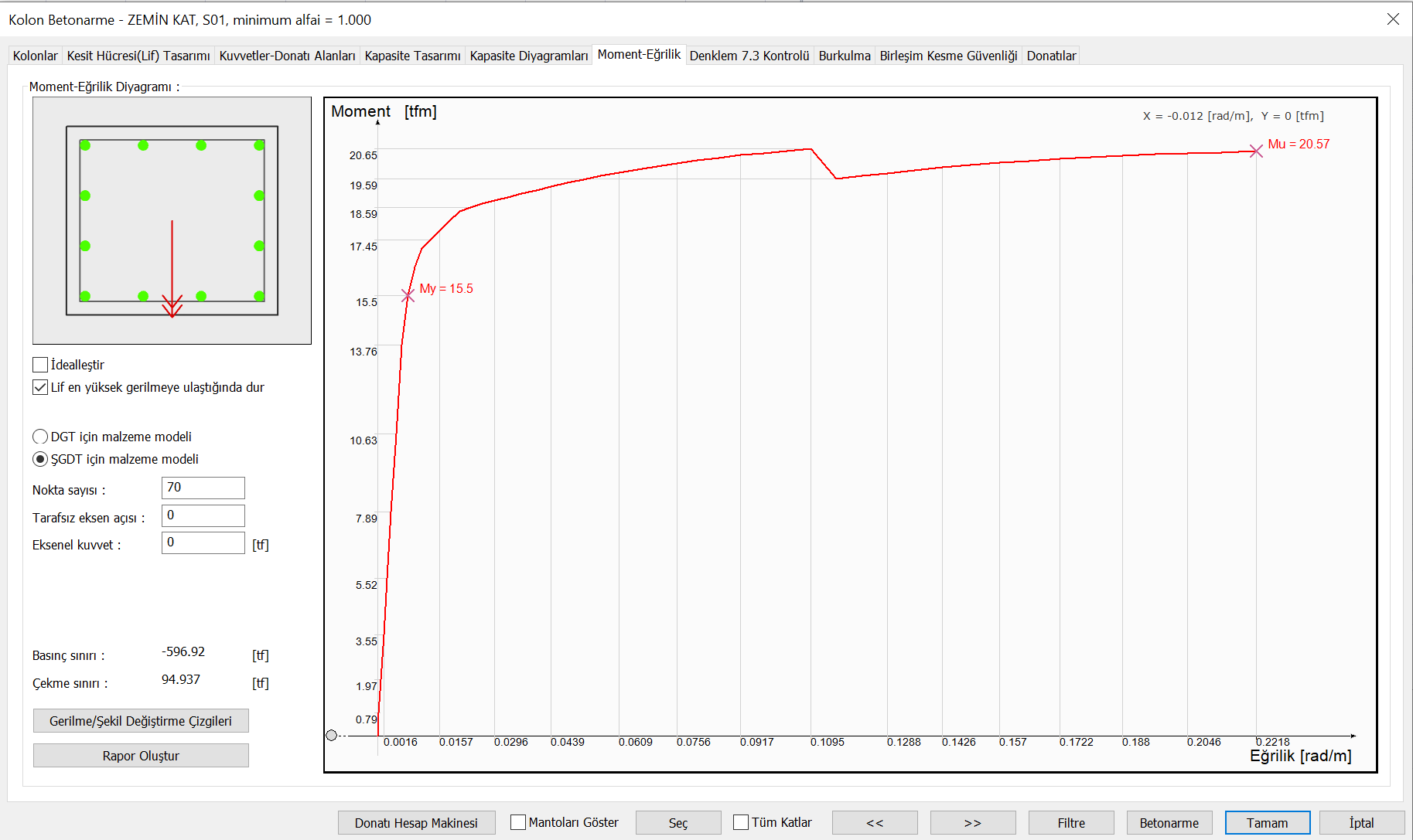 Malzeme modeli tanımından sonra kesitin moment-eğrilik analizi yapılır ve aşağıda gösterildiği gibi moment-eğrilik grafiği çizilir.