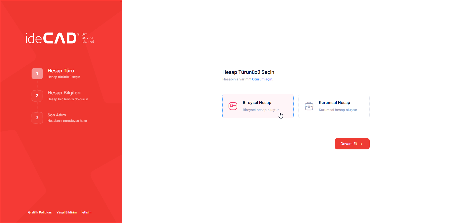 MyAccount üyelik oluşturma sayfasına hem https://idecad.com.tr/ üzerinden hem de ideYAPI OneClick üzeriinden ulaşılır.