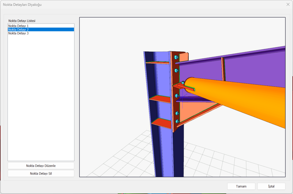 Önizleme ![]() Listede seçili nokta detay, birleşimler ve ilgili elemanlar gösterilir. |