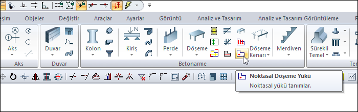 Noktasal Döşeme Yükü komutu ile döşeme üzerinde tekil yük tanımlanır. Noktasal döşeme yükünün, yük değerleri Noktasal-Çizgisel Yük Ayarları diyaloğunda tanımlanır.