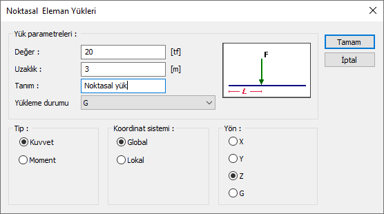- Noktasal Eleman Yükleri diyaloğu açılacaktır.