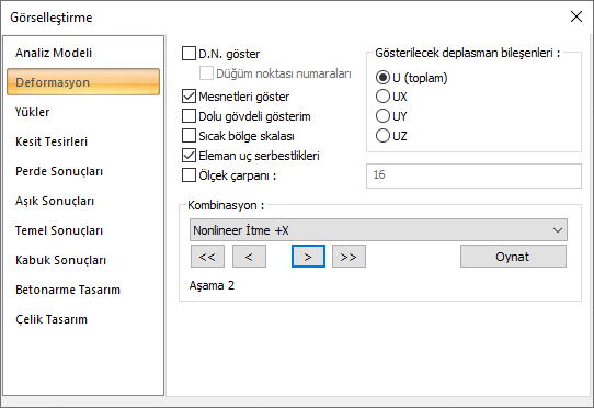Deformasyon sekmesi altında bulunan kombinasyon listesinden nonlineer kombinasyonlardan biri seçilerek görüntüleme sağlanır.
